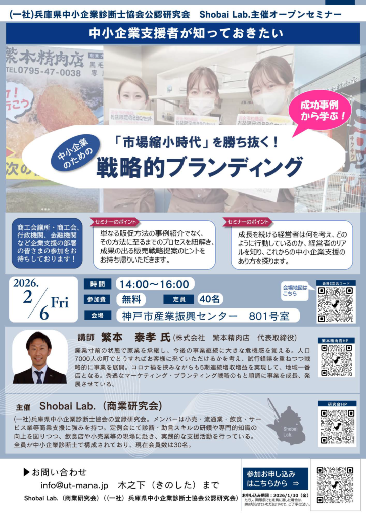 2026年2月6日(金)兵庫県中小企業診断士協会公認研究会「Shobai Lab.(商業研究会)」主催でオープンセミナーを開催します。支援機関、行政機関、金融機関の企業支援担当者様および中小企業診断士の皆様、ぜひ奮ってご参加ください!